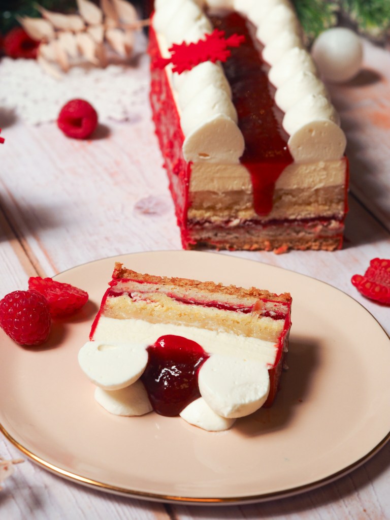 - Framboise Litchi Sureau : Streusel, biscuit, confit framboise–sureau, crémeux fleur de sureau, marmelade et mousse litchi, crème montée litchi–sureau et gel framboise