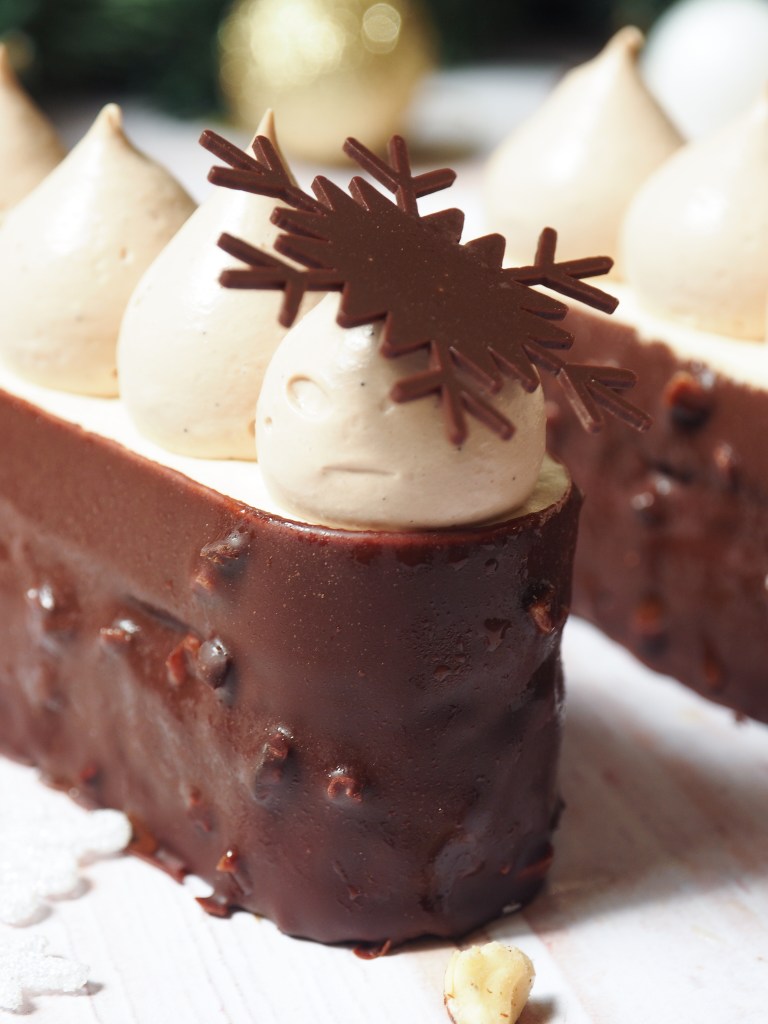 - Chocolat Noisette : Croustillant, dacquoise noisette, crémeux chocolat, praliné noisette, mousse noisette, crème montée au chocolat et gel praliné