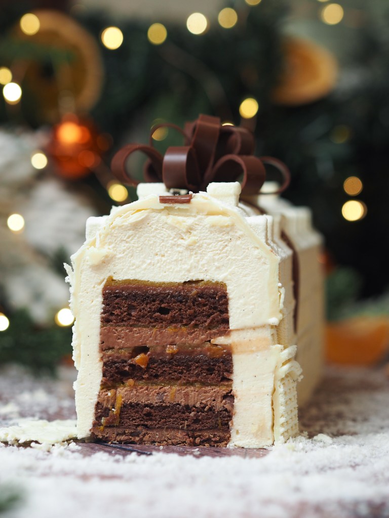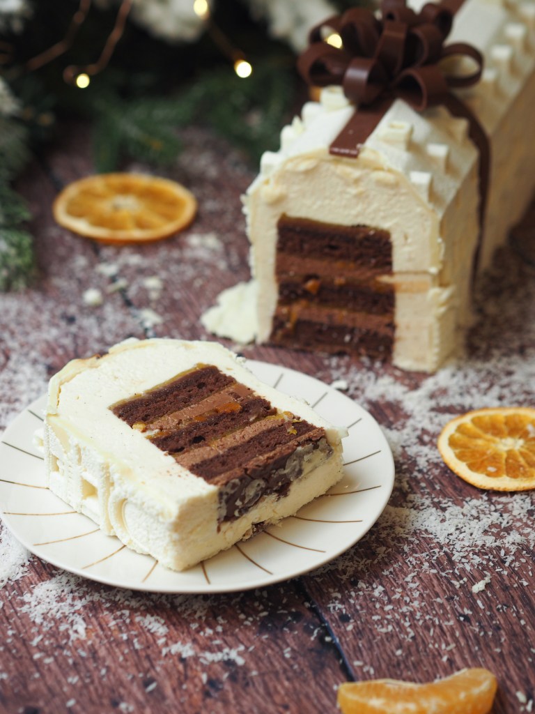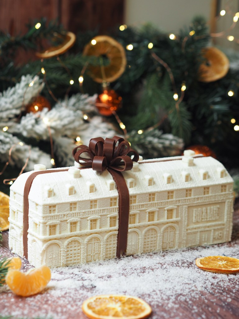La bûche Signature « La Rivoli » : Croustillant chocolat noir, crème montée à la mandarine, crémeux et caramel chocolat mandarine, marmelade de mandarine et biscuit moelleux au chocolat
